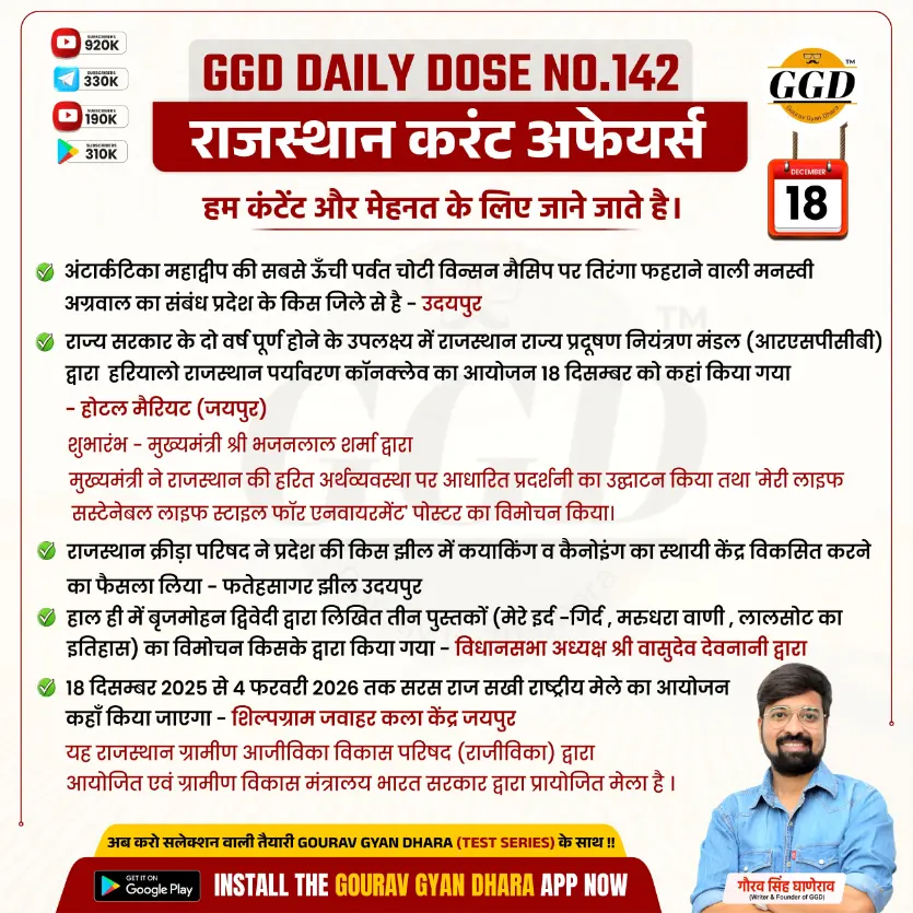(2) राज्य सरकार के दो वर्ष पूर्ण होने के उपलक्ष्य में राजस्थान राज्य प्रदूषण नियंत्रण मंडल (आरएसपीसीबी) द्वारा हरियालो राजस्थान पर्यावरण कॉनक्लेव का आयोजन 18 दिसम्बर को कहां किया गया – होटल मैरियट (जयपुर)