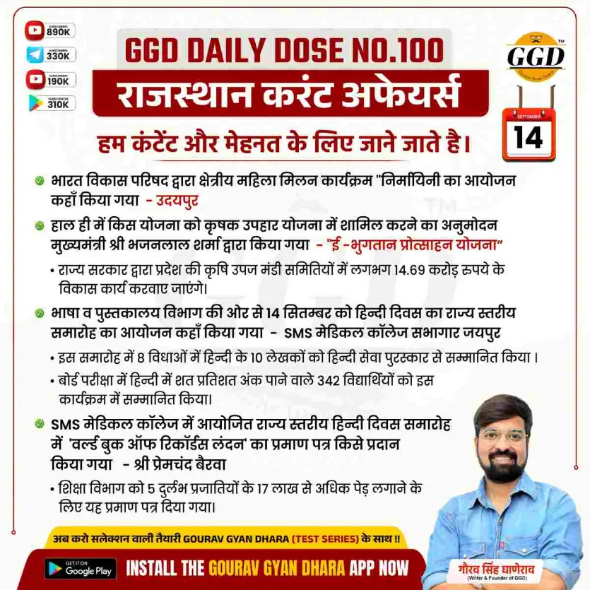 ③ भाषा व पुस्तकालय विभाग की ओर से 14 सितम्बर को हिन्दी दिवस का राज्य स्तरीय समारोह का आयोजन कहाँ किया गया – SMS मेडिकल कॉलेज सभागार जयपुर