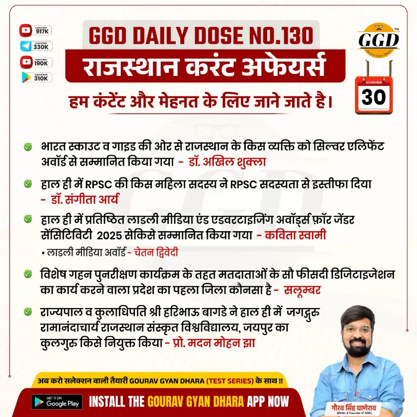 (1) भारत स्काउट व गाइड की ओर से राजस्थान के किस व्यक्ति को सिल्वर एलिफेंट अवॉर्ड से सम्मानित किया गया –डॉ. अखिल शुक्ला