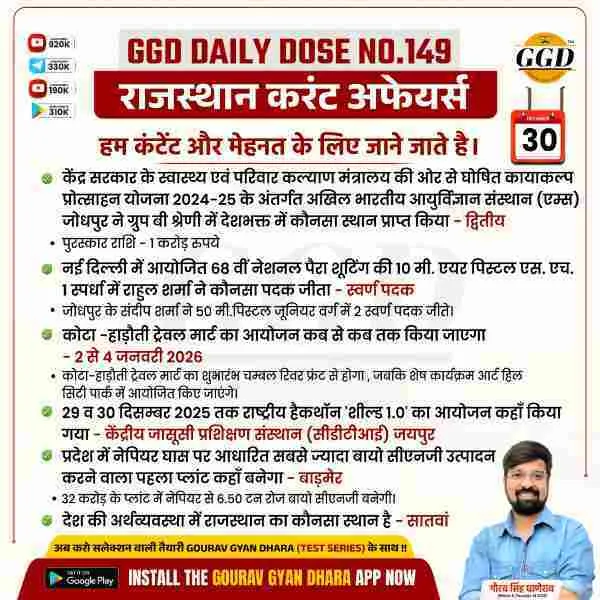 (1) केंद्र सरकार के स्वास्थ्य एवं परिवार कल्याण मंत्रालय की ओर से घोषित कायाकल्प प्रोत्साहन योजना 2024-25 के अंतर्गत अखिल भारतीय आयुर्विज्ञान संस्थान (एम्स) जोधपुर ने ग्रुप बी श्रेणी में देशभर में कौनसा स्थान प्राप्त किया – द्वितीय