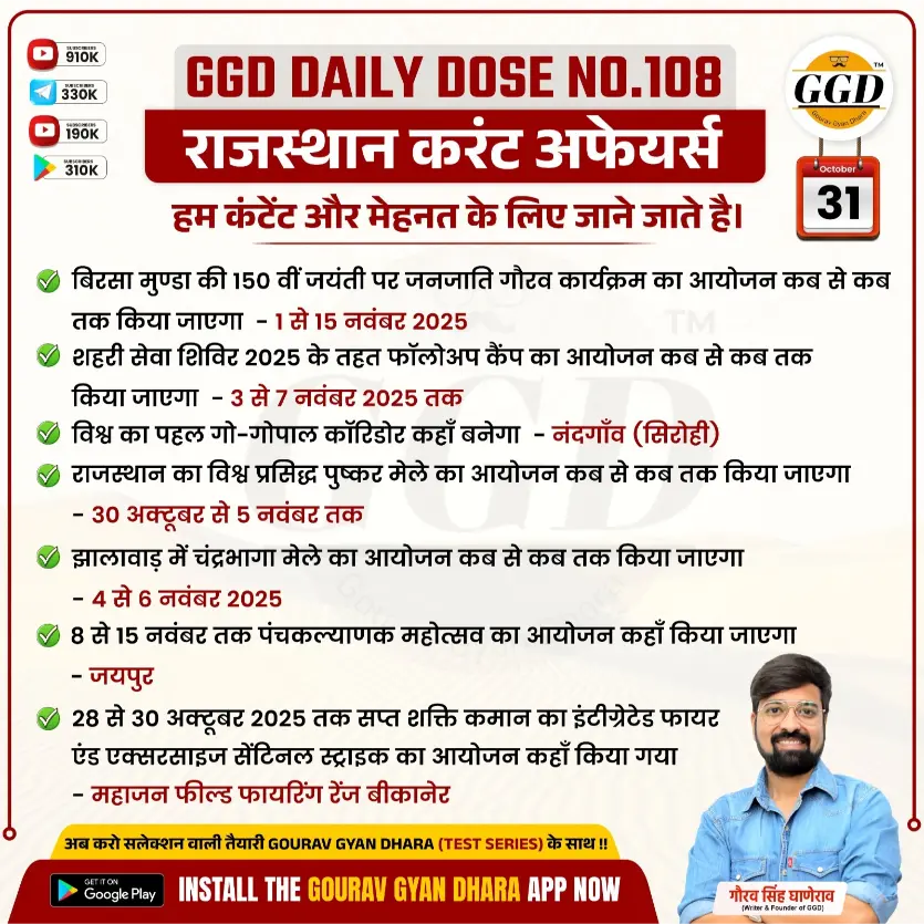 (4) राजस्थान का विश्व प्रसिद्ध पुष्कर मेले का आयोजन कब से कब तक किया जाएगा – 30 अक्टूबर से 5 नवंबर तक
