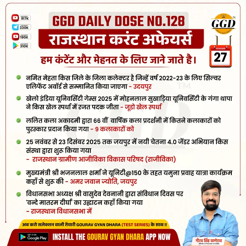 (4) 25 नवंबर से 23 दिसंबर 2025 तक जयपुर में नयी चेतना 4.0 जेंडर अभियान किस संस्था द्वारा शुरू किया गया –राजस्थान ग्रामीण आजीविका विकास परिषद (राजीविका)