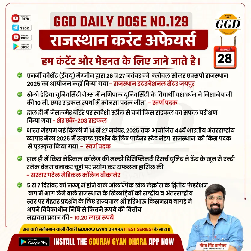 (1) एनर्जी कोशेंट (ईक्यू) मैग्जीन द्वारा 26 व 27 नवंबर को ग्लोबल सोलर एक्सपो राजस्थान 2025 का आयोजन कहाँ किया गया – राजस्थान इंटरनेशनल सेंटर जयपुर