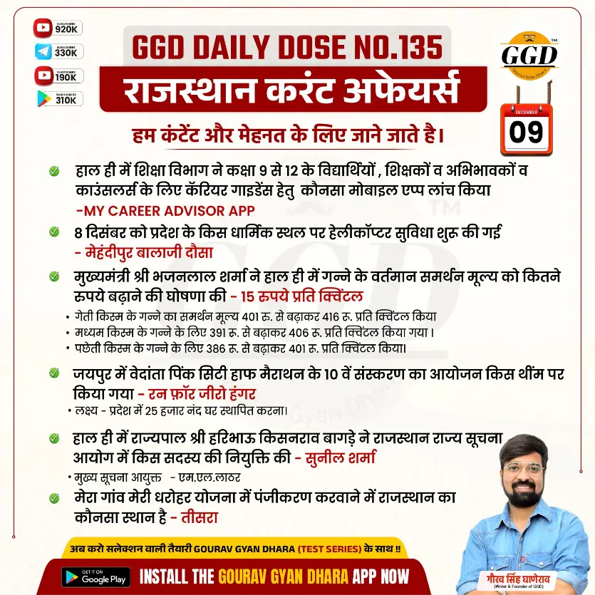 (3) मुख्यमंत्री श्री भजनलाल शर्मा ने हाल ही में गन्ने के वर्तमान समर्थन मूल्य को कितने रुपये बढ़ाने की घोषणा की – 15 रुपये प्रति क्विंटल