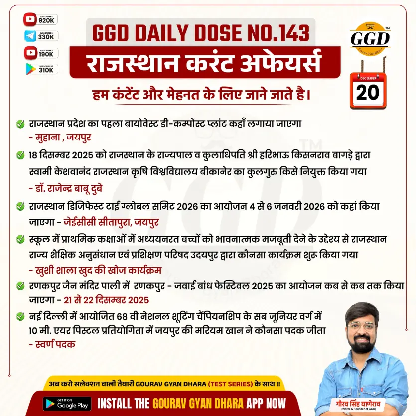 (2)18 दिसम्बर 2025 को राजस्थान के राज्यपाल व कुलाधिपति श्री हरिभाऊ किसनराव बागड़े द्वारा स्वामी केशवानंद राजस्थान कृषि विश्वविद्यालय बीकानेर का कुलगुरु किसे नियुक्त किया गया – डॉ. राजेन्द्र बाबू दुबे