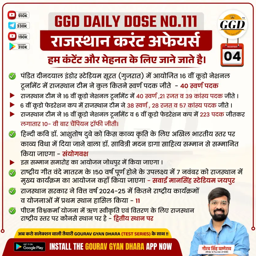 (1)पंडित दीनदयाल इंडोर स्टेडियम सूरत (गुजरात) में आयोजित 16 वीं कूडो नेशनल टूर्नामेंट में राजस्थान टीम ने कुल कितने स्वर्ण पदक जीते –40 स्वर्ण पदक