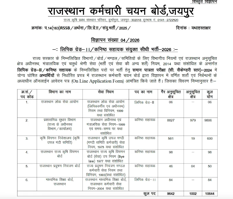 राजस्थान कर्मचारी चयन बोर्ड ने 10644 पदो पर LDC के लिए बम्पर वेकेंसी निकाली है।