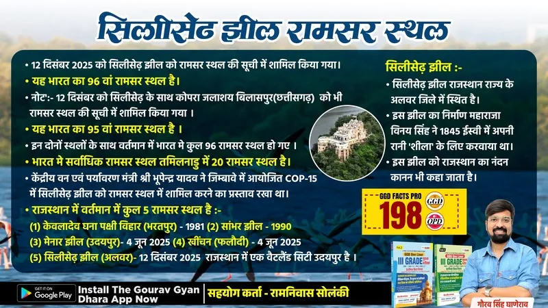 ◆ 12 दिसंबर 2025 को सिलीसेढ़ झील को रामसर स्थल की सूची में शामिल किया गया। यह भारत का 96 वां रामसर स्थल है।